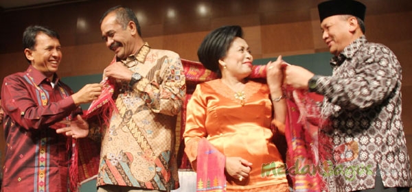 Gubernur Sumatera Utara Gatot Pujo Nugroho bersama Kapoldasu Irjen Pol Wisjnu Amat Sastro mengulosi Pangdam I/BB Mayjen Burhanuddin Siagian dan istri pada acara pisah sambut Pangdam I Bukit Barisan, Senin (10/6/2013) malam di Hotel Grand Aston, Medan. Selain itu juga diberikan cindera mata kepada Mayjend Lodewijk dan Mayjend Burhanuddin Siagian dari Gubsu dan pejabat lainnya. [Foto: Humas Pemprovsu]