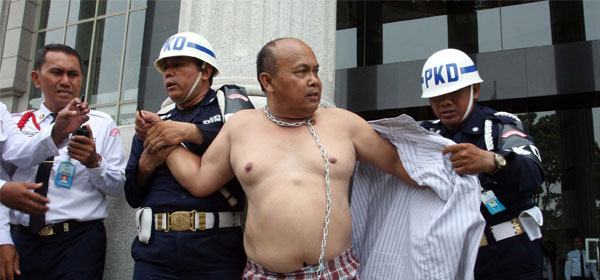 Petugas keamanan berusaha memakaikan pakaian pelaku aksi Arifin Wardiyanto dari Suara Independen Rakyat Indonesia (SIRI) DIY di Halaman Mahkamah Konstitusi Jakarta Pusat, Senin (24/9). Dalam aksinya Arifin menuntut pengusutan tuntas terkait dugaan ijazah palsu Wakil Gubernur DIY Paku Alam IX. Foto: RM/Randy Tri Kurniawan