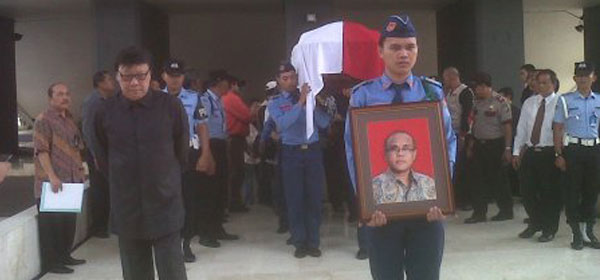 Jenazah anggota Komisi I DPR RI dari Fraksi-PDIP, Theodorus Jacob Koekerits, yang meninggal karena kecelakaan disemayamkan di gedung Nusantara, Komplek Parlemen, Senayan, Jakarta, pagi ini (Selasa, 25/9). Nampak Sekjen PDI Perjuangan Tjahjo Kumolo mengiringi jenazah Ondos, panggilan akrab Theodorus Jacob Koekerits. Foto: RMOL/Ruslan Tambak