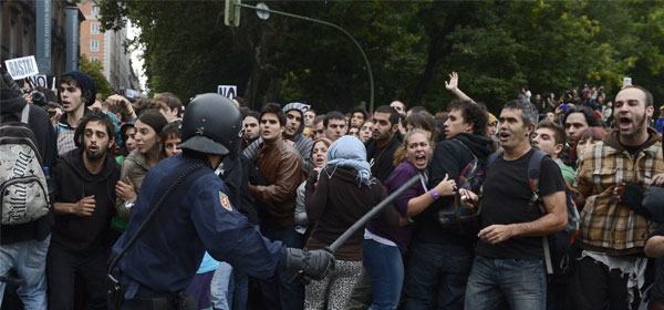 Bentrokan meletus setelah akhirnya polisi membubarkan massa demonstrasi di Madrid, Spanyol (25/9). Polisi membubarkan demonstrasi denga melepaskan peluru karet yang ditembakkan secara membabibuta. Foto: AFP/Philipe Marcou KOMENTAR