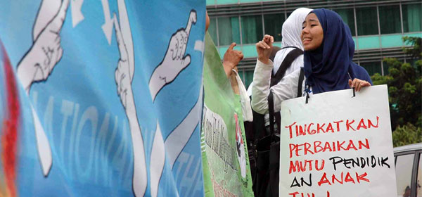 Penyandang Tuna Rungu menggelar aksi damai di Bundaran HI, Jakarta, Jumat (29/9). Mereka menentang diskriminasi terhadap penyandang tuna rungu, terutama pada media televisi. Foto: Indopos/Fukron Sukanda KOMENTAR