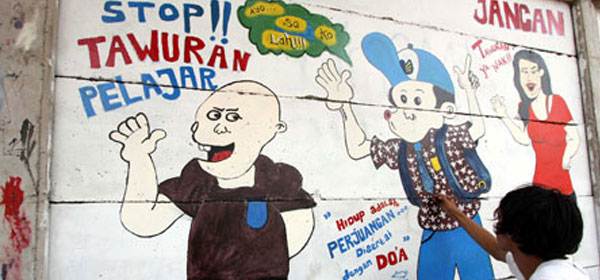 KOMENTAR Seorang pemuda menyelesaikan pembuatan mural bertuliskan "Stop Tawuran Pelajar" di kawasan Kawikawi bawah, Johar Baru, Jakarta, (Minggu 30/9). Dia prihatin tawuran menimbulkan korban jiwa. Foto: RM/M Iqbal Ichsan