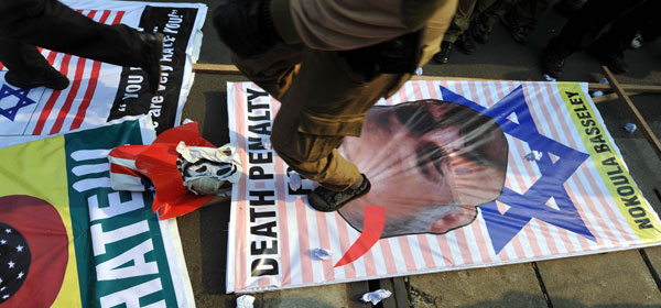 Kader Partai Keadilan sejahtera menginjak poster sutradara film penghinaan, Nakoula dalam aksi yang digelar di depan Kedutaan Besar AS, jakarta (30/9). Gelombang protes atas penghinaan dan provokasi anti-islam terus berlangsung di beberapa negara. foto: AFP/Adek Berry