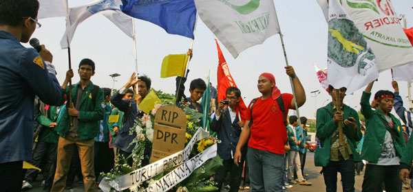 Puluhan Mahasiswa yang tergabung dalam BEM Seluruh Indonesia melakukan aksi unjuk rasa didepan gedung DPR MPR RI, Senin (01 Oktober 2012). Mereka menuntut 3 tahun kinerja DPR antara lain melakukan reformasi kinerja anggota dewan, menghukum mati koruptor didalam DPR, memecat anggota dewan yg tidak menjalankan fungsinya sebagai wakil rakyat. Foto: Indopos/Muhammad Ali