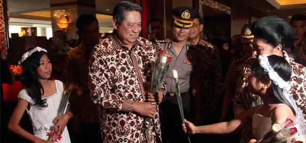 Presiden Susilo Bambang Yudhoyono bersama Ibu Negara Ani Yudhoyono berberi bunga mawar oleh angel cilik usai membuka Rapimnas KADIN 2012 di Hotel Shangri-la, Jakarta, Selasa (10/2). Rapimnas Kadin digelar Yogyakarta pada 3-4 Oktober 2012. Rapimnas kali ini bertemakan "Membangun Daerah dalam Rangka Mendukung Pemerataan Perekonomian Nasional". Kedepan, Kadin akan fokus untuk pembangunan didaerah. Foto: RM/Randy