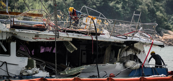 Petugas pemadam kebakaran memeriksa bagianbelakang kapal penumpang Lamma IV yang rusak setelah tabrakan dan terbakar di tepi Pulau Lamma, Hongkong (3/10). Kapal ferri Lamma IV bertabrakan pada 1 Oktober. Sebanyak 38 penumpang orang tewas dalam bencana terburuk di Honggkong dalam beberapa dekade belakangan ini. Foto: AFP/Lopez