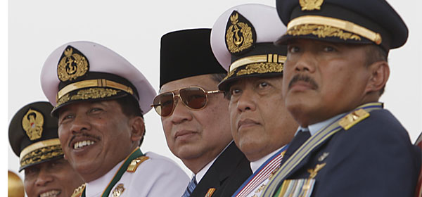 Presiden Susilo Bambang Yudhoyono bersama para panglima menonton atraksi udara di Hari Ulang Tahun (HUT) ke-67 Tentara Nasional Indonesia (TNI) di Bandara Halim Perdanakusuma, Jakarta, Jumat (5/10). Presiden dalam amanatnya mengingatkan kembali bahwa negara memberikan tugas kepada TNI untuk mempertahankan, melindungi, dan memelihara kedaulatan negara. Foto: Abror Rizki