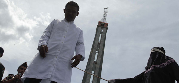 Tersangka kasus judi ( maisir) di cambuk tujuh kali oleh algojo di halaman Masjid Jantho, Aceh Besar, Jumat (5/10). Tersang terkena dalam undang-undang nomor 13 tahun 2003 tentang Syariah Islam. KOMENTAR