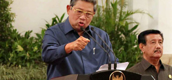 Presiden SBY saat menyampaikan sikapnya tentang persoalan KPK-Polri, (Senin 8/10) malam. Presiden mengintruksikan untuk penyidikan kasus dugaan korupsi simulator SIM yang melibatkan Irjen Djoko Susilo akan ditanggani oleh KPK. Foto: RM KOMENTAR