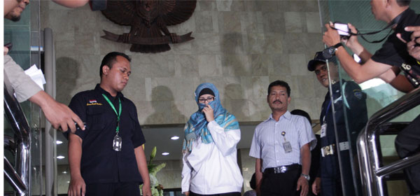 Tersangka kasus korupsi proyek Pembangkit Listrik Tenaga Surya (PLTS) Neneng Sri Wahyuni usai mendatangi kantor KPK Jakarta, Rabu (10/10). Setelah berkas pemeriksaan kasus korupsi di Kementerian Tenaga Kerja dan Transmigrasi tersebut dinyatakan lengkap (P21), Komisi Pemberantasan Korupsi (KPK) akan segera melimpahkan berkas tersebut ke penuntutan. Foto: RM/Wahyu Dwi