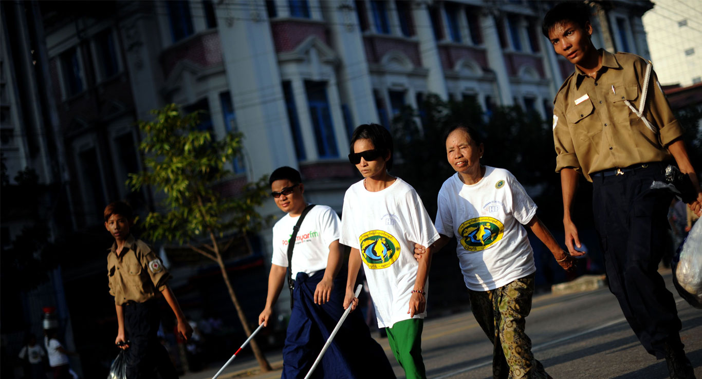 Sejumlah penyandang tuna netra ikut ambil bagian dalam acara Hari Peringatan Tuna Netra Netra di yangon, (15/10). Foto: AFP/Soe KOMENTAR