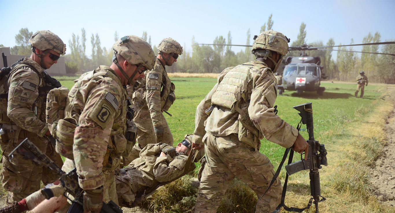 Seorang serdadu dari skuadron Airbone yang beroperasi di bawah komando Nato di Afghanistan tengah dievakuasi oleh rekannya. Ryan Thomas, prajurit berusia 21 tahun dari Oklahoma terluka setelah terlibat kontak senjata dengan gerilyawan Afghanistan. Sepanjang 11 tahun ini , tercatat sebanyak 2.135 prajurit AS tewas di Afghanistan. Foto: AFP/Munir Zaman