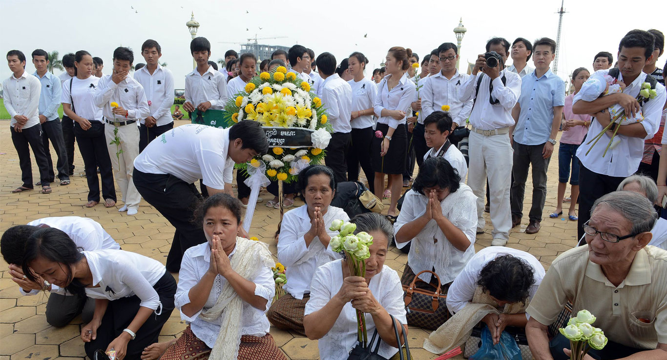 Rakyat Kamboja menggelar doa bersama untuk mengenang Raja Norodom Shihanouk di depan Royal Palace Phnom Penh, (16/10). Ribuan rakyat Kamboja menunggu kepulangan jenasah Norodom dari China. Foto: AFp/Tang Chin Sothy KOMENTAR