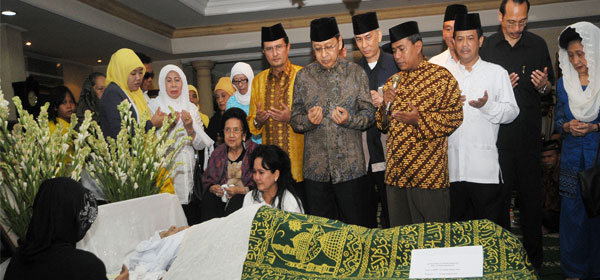 Wakil Presiden RI Boediono mengucapkan bela sungkawa kepada Istri almarhum mantan Gubernur DKI Jakarta, Letjen TNI (Purn) Wiyogo Atmodarminto, Jakarta, Sabtu (20/10). Wiyogo yang merupakan Gubernur DKI Jakarta periode 1987-1992, akan di makam di Taman Makam Pahlawan (TMP) Kalibata dengan upacara Militer. Foto: Jefri Tarigan/Indopos