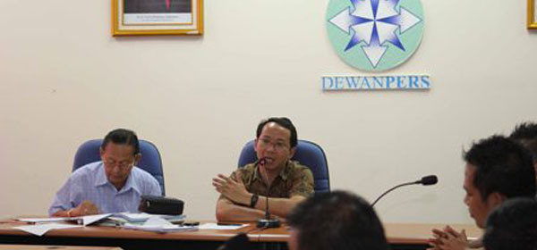 Ketua Komisi Pengaduan Masyarakat dan Penegakan Etika Dewan Pers, Agus Sudibyo (tengah); Mantan Wakil Ketua Dewan Pers, Leo Batubara (kiri) menerima fotografer Riau Pos yang menjadi korban kekerasan oknum TNI AU dan sejumlah wartawan lainnya di Gedung Dewan Pers, Kebon Sirih, Jakarta, Selasa (23/10). Kedatangan Wartawan Riau ini meminta dukungan pada pihak Dewan Pers supaya kasus dapat ditindaklanjuti dan menjadi momentum agar tidak ada lagi kekerasan terhadap wartawan di masa depan. Foto: RM/Randy