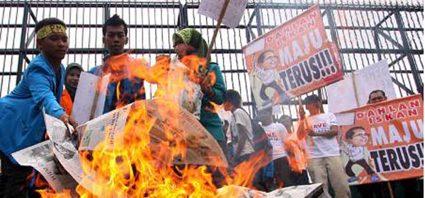 Demonstran menggelar aksi di depan Gedung DPR, Senayan, Jakarta, (Senin, 5/11). Mereka mendukung Menteri Dahlan Iskan untuk membersihkan praktek pemerasan yang dilakukan oknum anggota DPR. DWI PAMBUDO/RMOL KOMENTAR