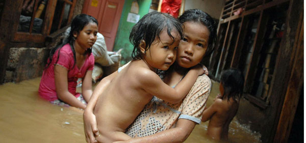 Sejumlah anak-anak bermain di depan rumahnya ketika banjir menggenangi Pemukiman di Bantaran Sungai Ciliwung, Bukit Duri Pangkalan RT 04/12, Kelurahan Bukit Duri, Jakarta Timur, Senin (19/11). Banjir yang mulai terjadi sekitar tengah malam tersebut akibat luapan air Kali Ciliwung kiriman dari Bogor, Jawa Barat. FOTO: RM