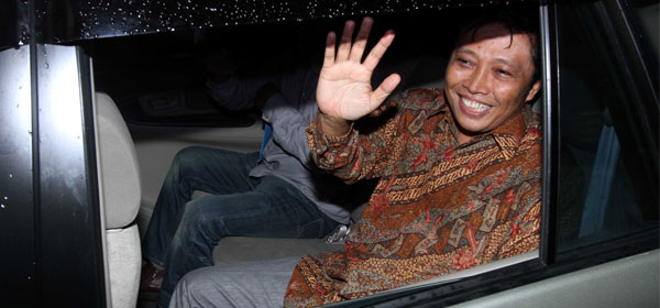 Direktur Utama PT Duta Sari Cipta Laras, Machfud Suroso melambaikan tangan usai menjalani pemeriksaan di Komisi Pemberantasan Korupsi (KPK), Jakarta, Senin (18/11). Ia diperiksa terkait pengusutan kasus korupsi pembangunan Pusat Pendidikan dan Pelatihan Sekolah Olahraga Nasional (P3SON) di Bukit Hambalang, Bogor, Jawa Barat. Foto: RM/M Ichsan
