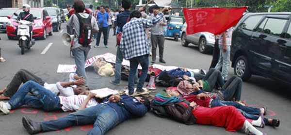 Gerakan Mahasiswa Indonesia menggelar aksi tutup jalan di Jalan Dipenogoro, Jakarta, (Kamis 6/12). Mereka menuntut Presiden SBY dan Wapres Boediono segera menyelesaikan kasus korupsi dan pelanggaran HAM. Foto: RM/Yazid KOMENTAR
