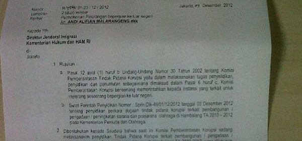 Surat permintaan cegah atas nama Andi Alfian Mallarangeng, Andi Zulkarnain Mallarangeng dan M. Arief Taufiqurrahman yang dikirim KPK ke Dirjen Imigrasi Kemenkumham tertanggal 3 Desember 2012. Dalam surat itu KPK menuliskan bahwa Andi yang kini menjabat menteri pemuda dan olahraga sebagai tersangka dalam kasus Hambalang. Foto: RMOL/Ruslan Tambak