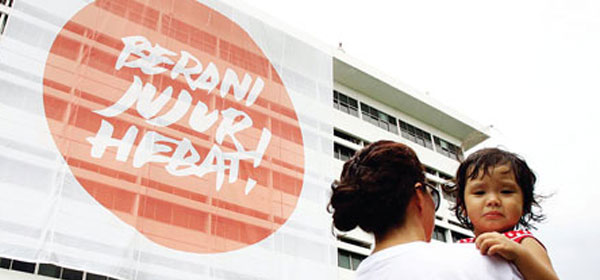 Aktivis Cinta Indonesia Cinta Anti Korupsi (CICAK) memasang spanduk "Berani Jujur Hebat" di sisi timur Gedung Kejaksaan Agung, Jakarta, (Sabtu 8/12). Kegiatan ini persiapan memperingati hari anti-korupsi sedunia. Foto: RM/Tedy Kroen KOMENTAR