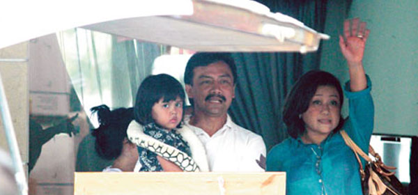 Andi Mallarangeng bersama istri, menggendong anaknya sebelum pindah dari rumah dinasnya di Komplek Widya Chandra ke rumah pribadinya di Cilangkap, (Sabtu 8/12). Foto: Khairil Anwar/RM KOMENTAR
