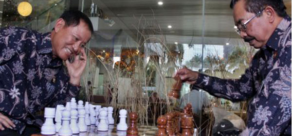 Menkumham Amir Syamsudin (kiri) bermain catur karya narapidana dengan Dirjen Pemasyarakatan Sihabudin pada pembukaan Napi Craft 2012 bertajuk "We Care" di Jakarta, Senin (17/12). Kerajinan narapidana dari berbagai lembaga pemasyarakatan tersebut diharapkan dapat mengembangkan kreativitas yang mempunyai nilai jual serta membangkitkan semangat pengabdian serta perubahan sikap, mental, spiritual agar dapat diterima kembali dalam masyarakat. Foto: RM