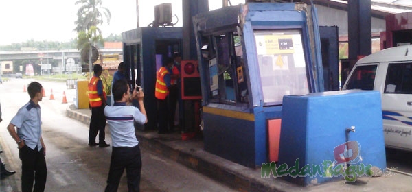 Gardu pintu keluar tol Amplas, Medan ditabrak truk tronton bermuatan alat berat dengan nomor polisi BK 9624 CC, Kamis sore (17/1/2013). Tabrakan ini mengakibatkan dinding gardu bagian atas retak dan kaca berserakan di jalan. Selain menyebabkan antrian panjang, insiden itu juga mengakibatkan seorang petugas jaga bernama Asber Manurung mengalami luka di bagian tangan akibat pecahan kaca. [Foto: Dedy Ardiansyah]