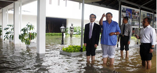 KOMENTAR Presiden ditemani Menlu, Mensesneg Sudi Silalahi dan Menlu Marty Natalegawa di tengah genangan air di Istana, (Kamis 17/1) pagi. Foto: RMOL