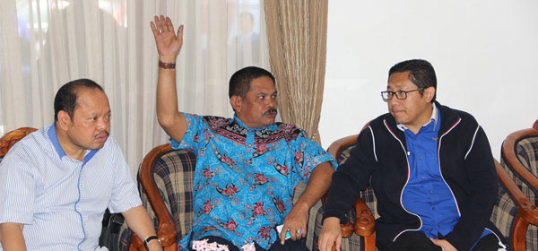 Walikota Medan Rahudman bercengkrama dengan Ketua Umum Partai Dermokrat Anas Urbaningrum dan pengurus DPP Partai Demokrat Soetan Bathoegana di ruang VIP kedatangan Bandara Polonia Medan, (19/1). Kedatangan Anas ke Medan untuk menghadiri perayaan natal oukumene di Brastagi, Kabupaten Tanah Karo. Foto: Hendro Budiman