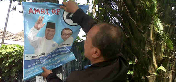 Petugas Panitia Pengawas Pemilu Sumatera Utara mencopot alat peraga kampanye yang melanggar Undang-Undang dan peraturan Pemilihan Umum, (Rabu, 20/2). [Dewi Syahruni]