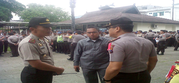 Kapolresta Medan, Kombes Monang Situmorang berbincang dengan Perwira Polresta untuk mengecek kesiapan pasukan pengamanan pada Rekapitulasi Perolehan Suara Pilgubsu 2013 yang dilakukan, Jumat (15/3/2013), hari ini, di Hotel Grand Angkasa. [Foto: Robedo Gusti]