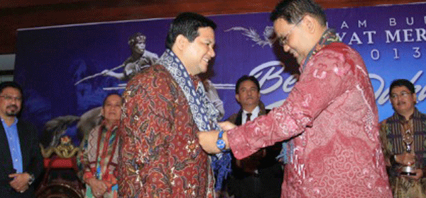 Ketua Komisi Pemilihan Umum (KPU) Husni Kamil Manik (kiri) menjadi salah seorang penerima Democracy Award yang diberikan Rakyat Merdeka Online pada Malam Budaya Rakyat Merdeka bertema "Beri Daku Sumba" di Hotel Sari Pan Pacific, Jakarta, Rabu malam (20/3). Pemimpin Umum RMOL Teguh Santosa yang menyerahkan penghargaan itu berharap KPU dapat berkerja keras menyelenggarakan pemilihan umum yang berwibawa. Teguh juga mengajak masyarakat ikut membantu KPU menciptakan pemilihan umum yang jujur dan adil. [Foto:RM]