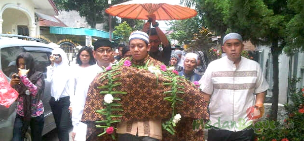 Fajeri Siregar berjalan sambil menggendong jenazah putrinya Nyfara Salsabilla Siregar untuk dimakamkan, Minggu (14/4/2013) siang. Bocah berusia 7 bulan itu, tak kuasa menahan penyakit langka yang diidapnya (atresia billier/kelainan hati) dan menghembuskan nafas terakhir di RS Colombia Medan, Sabtu malam. Diiringi isak tangis, ratusan pelayat ikut mengantarkan Nyfara ke tempat peristirahatan terakhirnya. [Foto: Istimewa]