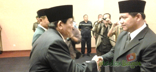 Jamaluddin Rambe menerima SK pengangkatan menjadi komisioner KPU Sumut dari Ketua KPU RI Husni Kamil Manik di Hotel Grand Angkasa. Jumat (3/5/2013). Bersama dengan Bengkel Ginting, ia resmi dilantik menjadi anggota KPU Sumut menggantikan dua komisioner yang mengundurkan diri Irham Buana Nasution dan Turunan B Gulo. [Foto: Robedo Gusti]