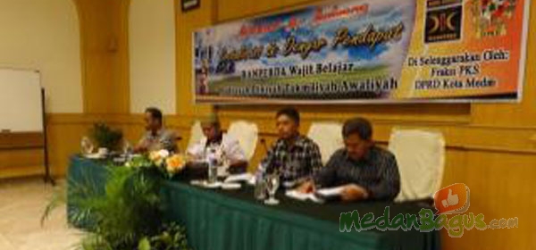 Ketua Fraksi PKS DPRD Medan, H Salman Alfarisi LC. MA, Wakil Ketua DPRD Medan H.Ikrimah Hamidy ST. M.Si dan Bendahara FPKS DPRD Jumadi.S.Pdi saat menggelar pertemuan dengan pengelola SD/IT se Kota Medan terkait pembahasan Ranperda Wajib Belajar MDTA, di Hotel Dharma Deli, Medan, Sabtu (18/05/2013) kemarin. [Foto: MedanBagus.Com]
