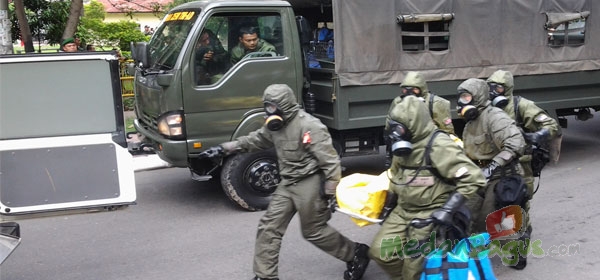 Pasukan khusus TNI/ATM mengevakuasi jenazah teroris yang tewas dalam penyergapan di Hotel Arya Duta, Medan. Hal ini menjadi rangkaian simulasi penanggulangan teroris oleh pasukan khusus Indonesia/Malaysia. [Foto: Robedo Gusti]