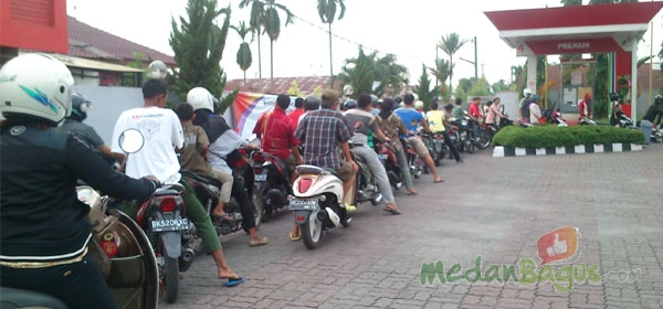 Antrian panjang terjadi di Stasiun Pengisian Bahan Bakar Minyak (SPBU) di Jalan Denai, Medan Jumat (21/6/2013). Antrian yang didominasi pengendara sepeda motor tersebut terjadi sejak pagi hingga sore hari itu terjadi menjelang rencana pengumumuman kenaikan Bahan Bakar Minyak (BMM) yang rencana dilakukan Jumat malam. [Foto: Oryza Yati]