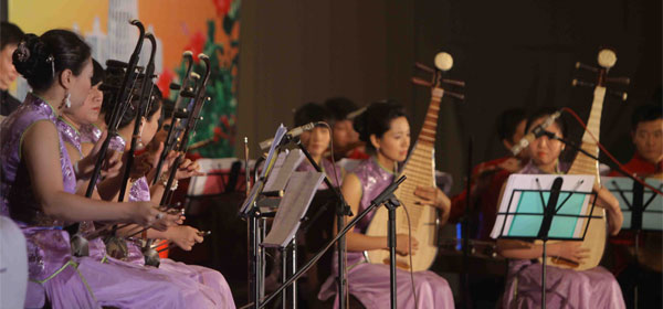 Sejumlah artis dari Guandong National Orchestra tengah memainkan musik tradisional Tiongkok dalam acara Malam Keakraban Pertukaran Budaya Propinsi Bersaudara Guandong-Sumatera Utara di Tiara Convention Hall, Senin (1/7/2013) malam. [Foto: Istimewa]