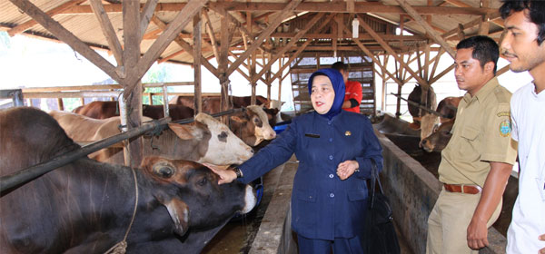 Kepala Dinas Peternakan Provinsi Sumatera Utara drh Tety Erlina Lubis saat berkunjungan ke peternakan Sapi Kelompok Kusuma Dalu di Tanjung Morawa, Deli Serdang, Rabu (31/7/2013). Dalam kesempatan itu, Tety memeriksa keamanan stok daging sapi menjelang hari raya Iedul Fitri. [Foto: Istimewa]