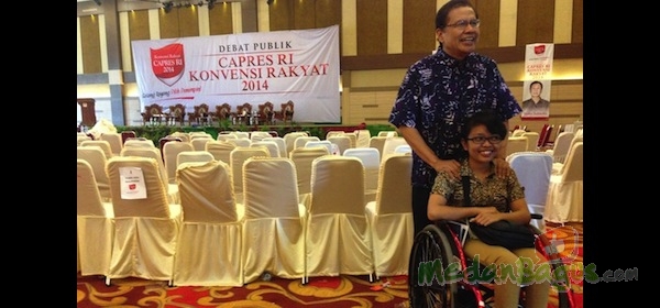 Calon presiden Konvensi Rakyat DR. Rizal Ramli berfoto bersama Sondang Novita Sitanggang, mahasiswa FISIP Universitas Sumatera Utara (USU) yang menghadiri debat capres Konvensi Rakyat di Medan Intrnational Convention Center, Jalan Gagak Hitam, Medan (Minggu, 19/1). Sondang yang kini duduk di semester lima adalah penyandang tunadaksa. Sebelumnya ia adalah seorang pemain taekwondo. Kepada Sondang, Rizal Ramli berpesan agar tidak pantang menyerah dan terus bekerja keras untuk menggapai cita-cita. MEDANBAGUS.COM