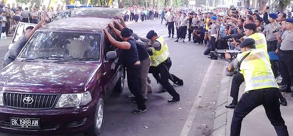 Petugas Kepolisian dari Unit Sabhara Polda Sumut menangkap sejumlah OTK yang melakukan pencurian kotak suara berisi kertas surat suara pemilu 2014. Penangkapan ini menjadi salah satu skenario 'Simulasi Pengamanan Pemilu 2014', yang dilakukan oleh jajaran Polda Sumatera Utara di Jalan Imam Bonjol, Medan, Kamis (13/2/2014). [Foto : Robedo Gusti]