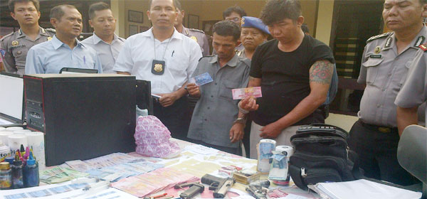 Dua tersangka pemalsuan uang, Amat Anto (43) dan Romi Pasla (34) menunjukkan uang palsu yang mereka produksi, di halaman Polsek Batang Kuis, Deli Serdang, Kamis (13/2/2014). Keduanya ditangkap oleh polisi karena melakukan praktik pemalsuan uang dengan menggunakan perangkat komputer dan printer. Dari keduanya, polisi menyita Rp 80 juta uang palsu dalam bentuk pecahan Rp 100.000, Rp 50.000, Rp 20.000, Rp 10.000, serta soft gun dan beberapa barang bukti lainnya. [Foto : Sahabat medanbagus.com]