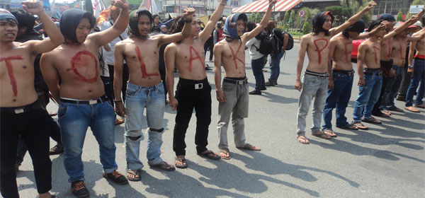 Belasan pengunjuk rasa menyerukan penolakan menolak pemilu 2014 saat menggelar aksi unjuk rasa di Bundaran Majestyk, Jalan Gatot Subroto, Medan, Kamis (27/2/2014). Mereka menyebutkan pemilu telah gagal menghasilkan suksesi kepemimpinan politik yang benar-benar mengabdi kepada rakyat seutuhnya dan menuding pemilu hanya sebagai ajang pesta para elit politik yang haus kekuasaan.[Foto : Robedo Gusti]