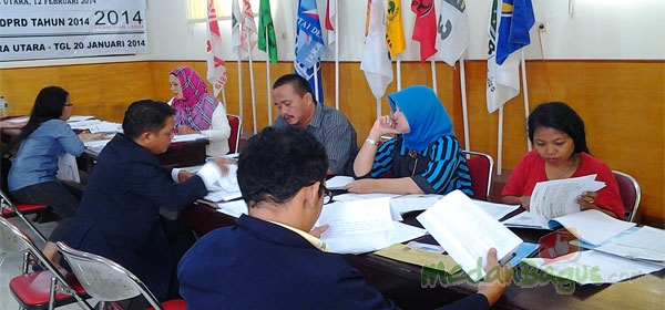 Sejumlah perwakilan Partai Politik maupun perwakilan Calon DPD RI asal Sumut terlihat mengantri untuk melaporkan dana kampanye parpol maupun Calon DPD yang diwakilinya, di Aula KPU Sumut, Jalan Perintis Kemerdekaan, Minggu (2/3/2014). Hari ini merupakan batas akhir pelaporan dana kampanye secara nasional. Parpol maupun Calon DPD yang tidak melaporkan rekening dana kampanyenya hari ini akan mendapatkan sanksi diskualifikasi sebagai peserta pemilu.[Foto : Robedo Gusti]
