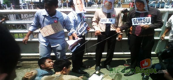 Tiga orang pengunjuk rasa masing-masing mengenakan topeng Gubernur Sumatera Utara Gatot Pujo Nugroho, Dirut PLN Nur Pamuji dan Menteri BUMN Dahlan Iskan sedang 'menyeret' leher warga. Hal ini menjadi salah satu bagian aksi teatrikal yang dilakukan oleh massa pengunjuk rasa dari LBH Medan dan Asosiasi Pengusaha Indonesia (Apindo) di depan Kantor Gubernur Sumatera Utara, Jalan Diponegoro, Medan, Rabu (5/3/2014). Aksi ini sebagai bentuk sindiran masyarakat terhadap ketiga pejabat tersebut, yang dinilai tidak mampu memberikan solusi atas krisis listrik yang terjadi di Sumatera Utara.[Foto : Suhardiman]
