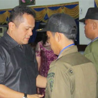 Eddy Syofian menyematkan tanda peserta Pelatihan Pengamanan Pemilu bagi Personil Perlindungan Masyarakat (Linmas) Kabupaten dan Kota se-Sumut di Balai Pengembangan PAUDNI Medan. [Foto: Istimewa]