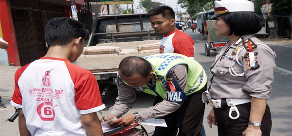 Personil Satuan Lalu Lintas (Satlantas) Polresta Medan memberikan surat Bukti Pelanggaran (Tilang) kepada simpatisan partai politik yang hendak mendatangi lokasi kampanye PKPI di Lapangan Bola, Jalan Dahlia Raya, Helvetia, Rabu (19/3/2014). Pemberian tilang tersebut menjadi salah satu upaya dari pihak kepolisian untuk menegakkan aturan berlalu lintas di Kota Medan selama pelaksanaan jadwal kampanye terbuka. Pihak kepolisian menyebutkan, pihaknya telah mengeluarkan puluhan tilang kepada pengendara yang tidak mengenakan perlengkapan keselamatan berkendara sejak dimulainya tahapan kampanye terbuka partai politik di Kota Medan yang mulai berlangsung 16 Maret 2014 lalu.[Foto : Robedo Gusti]