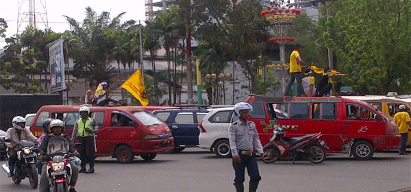 Personil Satlantas Polresta Medan dan Personil Dinas Perhubungan Kota Medan terlihat membiarkan iring-iringan massa pendukung Partai Golkar yang sedang beriringan menuju Lapangan Merdeka, Medan, meski beberapa penumpangnya terlihat mengabaikan keselamatan, Kamis (20/3/2014). Sikap ini sangat berbeda dibanding pada pelaksanaan kampanye terbuka dari partai lain sebelumnya. Dimana, petugas kepolisian langsung menindak tegas simpatisan partai yang tidak mengenakan perlengkapan keselamatan berkendara saat akan menuju lokasi kampanye. Tindakan tegas tersebut dilakukan dengan memberikan surat bukti pelanggaran (tilang) kepada pengguna kendaraan tersebut.[Foto : Robedo Gusti]