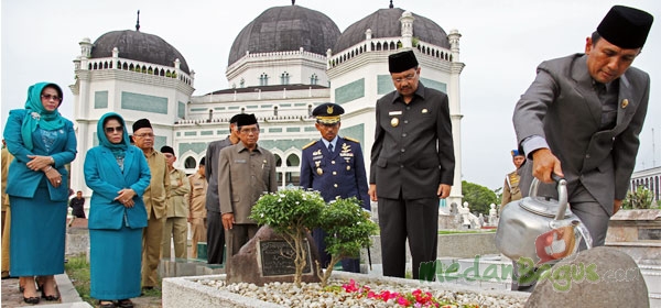 Gubernur Sumatera Utara (Gubsu) H. Gatot Pujo Nigroho, ST, M.Si bersama Wakil Gubernur Sumatera Utara (Wagubsu) Ir. H. Tengku Erry Nuradi, M.Si, Sekretaris Daerah (Sekda) H. Nurdin Lubis, SH, MM dan Wakil Ketua Darmawanita Pemerintah Provinsi Sumatera Utara (Sumut) Hj Evi Diana Erry besert Muspida Plus bernziarah ke makam mantan Gubsu Alm HT Rizal Nurdin di areal komplek pekuburan Mesjid Raya Al Mahsun, Jl. Sisingamangaraja Medan, dalam rangka Hari Jadi Pemprov Sumut ke 66, Senin (14/4/2014). [Foto: Istimewa]